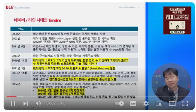 (01:03) 때마다 아 이거 다시 공부하자니 복잡하고 아 그고 하자이 찝찝하고 그러고 있었는데 이렇게 시간 아끼고 변호사님 약간 부려먹으면서 어 사디 정 기승 정결 정리를 좀 해봐요 이렇게 시킬 수 있어서 다행입니다네 아 안변 사님 너무 좋아요 아 지난번에 미니진 때도 우리가 열심히 배웠는데 무법인 dlg 예 스타트업 스타트업들의 친구 범인 dlg음 그러면 이제 뭐부터 좀 사건이 어떻게 됐는지부터 정리를 해봐야 될까요네 그렇죠 일단 타임라인을 좀 알아봐야 될 거 같아요이 이제 기사들이 하도 막 속보 럼 뜨고 막 그러다 보니까 타임라인을 조금 알아보고 싶은데 사실 처음에 네이버가 번에 진출해서 한 게임 서비스로 우리 한 게임 옛날에 기억하시나요 한 게임으로 이제 시작을 했어요 그게 이제 2000년도에 진출을 했고요 그때 회사 이름이 한개인 재팬이 있다가 NHN 재팬 네이버 재팬 이런 식으로 이제제 변화가 되면서 를 하나하나 잡습니다음 그러다가 2011년 6월이 한 13년 정도 전인데 그때 라인이 처음으로