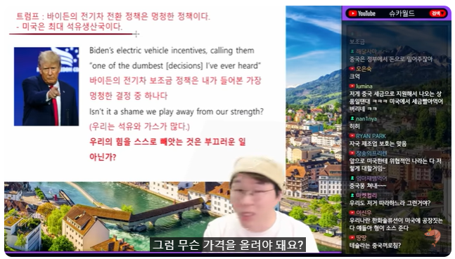 (02:14) 이 관세폭탄이 왜 묘수에 가깝냐? 바이든이 이 관세폭탄을 발표하면서 이렇게 얘기했습니다 인위적인 가격 인하를 통해서 세계 시장을 어지럽히는 중국의 불공정 무역에 대한 대응이다 우리가 자유무역을 해야 하는 게 아니라 중국이 불공정 무역을 하고 있기 때문에 그것에 대한 대응을 하는 것 뿐이야 미국의 근로자와 기업을 불공정 무역에서 보호하기 위한 거다 왜냐? 바이든 입장에서 이게 왜 묘수냐? 사실은 트럼프가 뭐라고 얘기하고 있었냐면 바이든의 전기차 전환 정책은 정말 멍청한 정책이다 생각을 해봐라 미국은 세계 최대의 석유 생산국이야 그럼 무슨 가격을 올려야 돼요? 석유의 가격을 올리고 석유의 쓰임을 올려야 돼 그러니까 우리가 그게 제일 많아 석유도 많고 셸 가스도 있어 가스도 많아 이게 우리의 힘인데 전기차 같은 걸 하면 그게 힘이 떨어지잖아 우리의 힘을 스스로 빼앗는 거야 전기차 보조금 정책 전기차 전원 정책은 내가 들어본 가장 멍청한 결정이다 라고 까고 있었거든요 그냥 이렇게 얘기했습니다 봐라 봐라