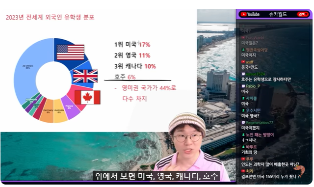 (00:07) 자, 마지막 얘기는 외국인 유학생의 시대를 한번 말씀드릴 거예요 외국인 유학생의 시대 그리고 어떤 나라가 고민이 있다 라는 내용을 한번 해보도록 하겠습니다 세계에서 가장 인구가 많은 두 나라가 발전을 했습니다 중국과 인도가 발전을 하고 GDP가 오르고 개혁 개방을 하고 IT기술이 발전하고 돈을 많이 버는 사람들이 늘어나니까 모두가 다 신분상승의 욕망이 있고 해외에 나가서 공부하고자 하는 욕망이 솟구치죠 그래서 해외여행도 물론 폭증을 했지만 전세계 외국인 유학생 수가 엄청나게 증가하고 있습니다 2001년에는 한 200만 명 정도가 외국에서 유학을 했는데 현재 해외의 유학생 수는 2021년 기준으로 600만 명을 넘었어요 3배 정도 증가했습니다 앞으로 더 크게 증가할 가능성이 굉장히 높다고 얘기를 하고 있습니다 그러면 2023년 기준으로 이 외국인 유학생이란 사람들은 어느 나라에 많이 갔냐? 우리나라도 마찬가지죠 외국 유학 많이 하니까 1위가 당연히 미국이고요 2위가 영국이고 3위가 캐나다고 호주가 6%로 5등 정도에 있습니다