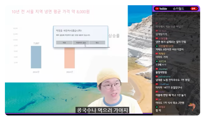 (01:07) 콩국수나 먹으러 가야지 하고 여의도에 있는 콩국수를 먹으러 갔더니 15,000원이야! 이것도 오랜만에 가서 그런지 야 진짜 좀 생경한 느낌 어? 야 15,000원이었어? 그 생경한 느낌 물론 여의도에서 그렇긴 하지 원래 비싸 원래 비싸지만 그래도 뭔가 점프한 느낌이 강렬하게 드는데 마지막이 얼마인지 기억이 안 나요 이야 그래도 뭔가 아니다 싶은 느낌이 확 왔죠? 복날이 다가오니까 얼마 전 삼계탕 먹었는데 삼계탕 2만 원이었거든요? 여긴 안 놀랐습니다 왜냐? 면 종류에 놀라다 보니까 2만 원 삼계탕은 왠지 가성비 같아 야 이상하던데? 삼계탕 얼마야? 2만 원! 그러니까 오 괜찮네 냉면이 1,6000원인데 삼계탕 2만 원이면 괜찮지 2만 원이...
