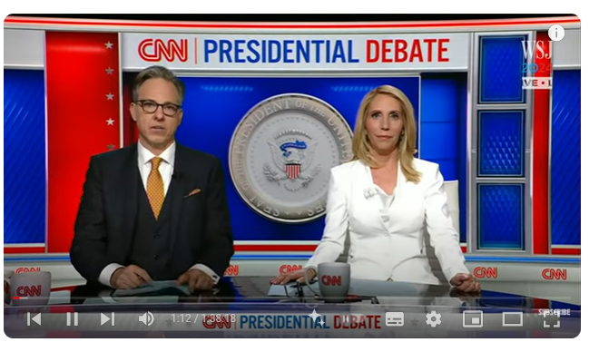 (00:35) com CNN Max and CNN espanol this is a pivotal moment between President Joe Biden and former president Donald Trump in their rematch for the nation's highest office each will make his case to the American people with just over four months until election day good evening I'm Dana Bash anchor of CNN's inside politics and co-anchor of State of the Union I'm Jake Tapper anchor of CNN's the lead and co-anchor of State of the Union Dana and I will co-moderate this evening our job is to facilitate a debate between the
