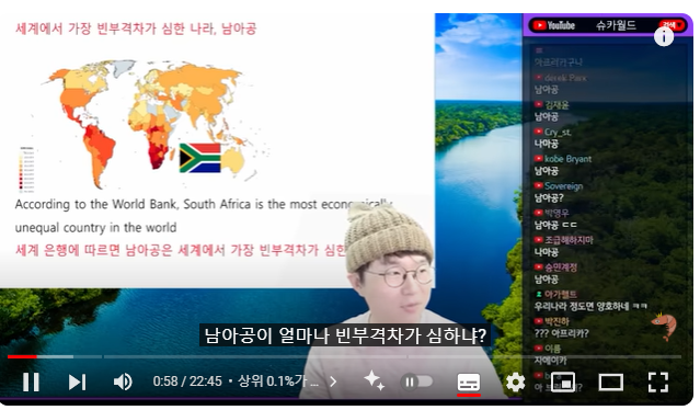 (00:07) 자, 오늘의 주제를 한번 시작을 해보죠 자, 오늘의 첫 번째 주제 한번 맞혀보시기 바랍니다 세계에서 가장 빈부격차가 심한 나라 맞히기 어렵다 이거 맞히기 어렵다 야 이거 맞히기 어려워요 이거 맞히기 어렵습니다 중국 아니고요 중국 아닙니다 세계에서 가장 빈부격차가 심한 나라 넌센스 아닙니다 어딜까? 인도 아니고요 우리나라 당연히 아니죠 우리나라 빈부격차가 이렇게 심한 나라 아닙니다 오! 정답이 지나갔어 검색해본 게 아닌가? 정답이 확 지나가는데 대단하십니다 자, 지도를 보면 알 수 있어요 가장 새빨간 곳에 있는 나라가 어딥니까? 바로 여기죠 여기가 어디야 ㅎㅎ 여기가 어딥니까? 여러분들이 아마 교과서에서나 들어봤을 나라 바로 남아공입니다 세계에서 가장 빈부격차가 심한 나라라고 꼽히는 게 남아공이에요 세계은행 기준이고요 보시면 알겠지만 엄청나게 새빨갛죠? 남아공이 얼마나 빈부격차가 심하냐? 일단 상위 0.