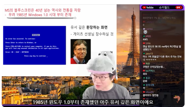 (00:07) 즐거운 주제로 하나 하죠 블루스크린 대란 우리나라에서는 굉장히 별거 아닌 것처럼 지나갔습니다 블루스크린 대란이 뭐냐? 이거 전 세계를 휩쓴 블루스크린 대란이 있었어요 근데 우리나라에서는 뭐야? 뭐 아무것도 없잖아 아무런 일이 없는 것처럼 지나갔어요 왜 그랬을까? 요 한 15분, 20분을 보면 왜 우리나라는 조용히 지나갔는지를 간단하게 알 수 있습니다 자, 내용을 보면 7월 19일 오후 3시 마이크로소프트의 윈도우에서 갑자기 블루스크린이 뜨는 전 세계의 컴퓨터가 블루스크린으로 한 800만 대가 덮였어요 물론 그래봐야 윈도우 쓰는 컴퓨터의 1%도 안된다고 합니다 엄청나죠 8억대가 쓰는데 800만이니까 1% 밖에 안되는데 전 세계 800만 컴퓨터가 블루스크린으로 덮였습니다 그것도 갑자기 이거 얘기 조금 더 드리기 전에 마이크로소프트의 블루스크린 모르시는 분은 없겠지만 놀랍게도 40년의 역사와 전통을 자랑합니다 1985년 윈도우 1.