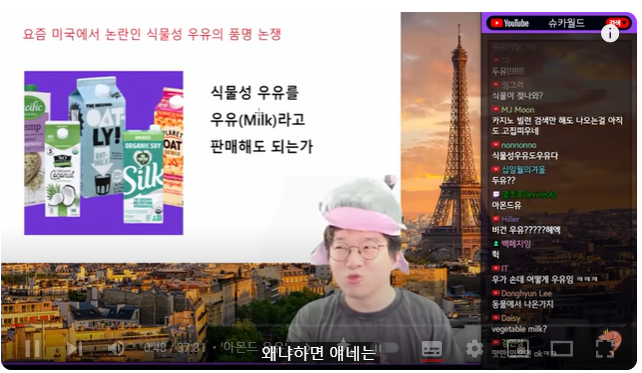 (00:07) 이 주제는 그냥 재미있는 주제예요 간단하게 볼 수 있습니다 어떻게 생각하십니까? 식물성 우유는 우유인가? 라는 주제를 갖고 왔는데 식물성 우유는 우유입니까? 대한민국 사람들은 이 주제에 별로 민감하지 않아요 왜냐하면 좀 이따 말씀드리겠지만 우유가 뭐예요? 우린 '소 우(牛)'자잖아 소의 젖이니까 이 우유라는 거 아래 카우(Cow)가 이미 들어가 있어 낙농업에 젖이라는 게 들어가 있거든요 그래서 대한민국 사람들 보면 뭐야 우유는 우유고 이거 두유는 두유지 뭘 식물성 우유를 우유라고 불러 이렇게 생각하는데 서양은 아닙니다 그걸 한번 보여드리도록 하겠습니다 왜 서양은 아니냐 특히 미국에서 이게 논란인데 식물성 우유를 왜냐하면 얘네는 우유 카우 젖 이게 없어요 '소 우'가 아니라 그냥 '밀크'잖아 근데 밀크에는 잘 생각해보면 카우라는 게 없습니다 카우가 없어 에에 잘못 지었어 야 우리 봐 우유 '소 우(牛)'자 그 '젖 유(乳)'자잖아요 소의 젖 그니까 아무런 그게 없어요 그래서 우리 식물성 우유
