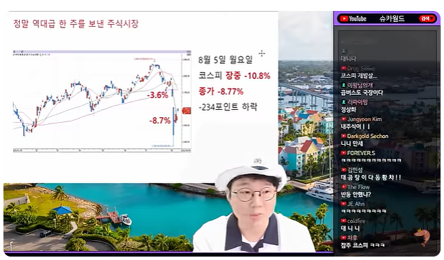 (01:03) 선방한게 지난 8월 5일 월요일 날 코스피의 모습이었고요 이게 얼마나 많이 빠진 거냐요 장대 음봉 코스피 역사상 폭으로는 퍼센 말고 폭으로는 역사상 최대 폭 하락했습니다 200포인트 이상 하락이 처음 있는 일이라고 하는데 저 장중 최대 빠졌을 때 289.2 포인트 전 3자 찍을 줄 알았어 세상이 망하는 줄 알았어 세상이 망하는 줄 알았어 이때 공포 그 자체 300 포인트를 찍냐 하루에 와 이거 그때 느낌은 느껴 보신 분은 압니다 와 이게 분명히 별일 없는 거 같은데 이렇게 빠지면 내가 모르는 뭔가 있냐라는 그 공포가 사로잡히기 때문에 시가 초에 190조 날아갔고 삼성전자 -1.