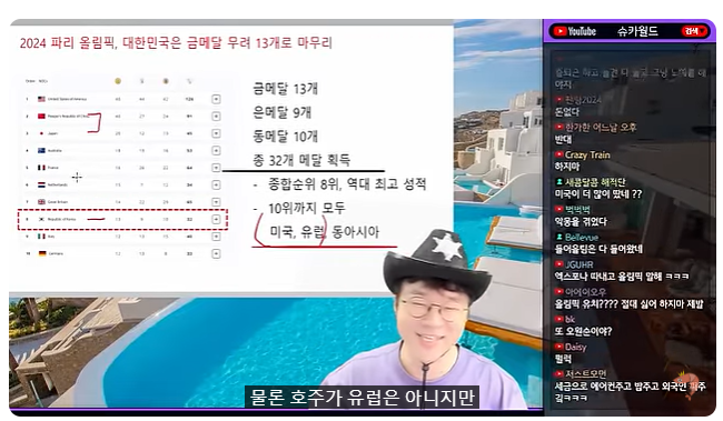 (00:07) 재밌는 주제, 박수칠 수 있는 주제 2036년 서울 올림픽을 유치하는 걸 추진하고 있다고 합니다 2036년 서울 올림픽 아, 오랜만에 들어요 서울 올림픽 대한민국이 갑자기 들리는데 노래가 핸드 인 핸드 2036 서울 올림픽 유치를 추진한다고 그 얘기를 한번 해보도록 하겠습니다 일단 파리 올림픽부터 얘기해야죠 2024년 파리 올림픽은 대한민국은 끝났죠 금메달 무려 13개로 마무리했습니다 선수단 규모는 작았는데 우리 선수들 대단해요 금메달 13개 은메달 9개 동메달 10개 총 무려 32개의 메달 종합순위 8위 역대 최고 성적이라고 합니다 메달 숫자로 봤을 때 이번에 1위에서 10위까지 순서를 보면 미국, 유럽, 동아시아가 모두 다 차지했습니다 미국, 유럽을 사실 서구라고 보면 서구와 동아시아 미국, 중국, 일본, 호주, 프랑스 네덜란드, 영국, 이탈리아, 독일, 한국 물론 호주가 유럽은 아니지만 미국이나 호주나 프랑스나 네덜란드나 영국이나 이탈리아나 독일