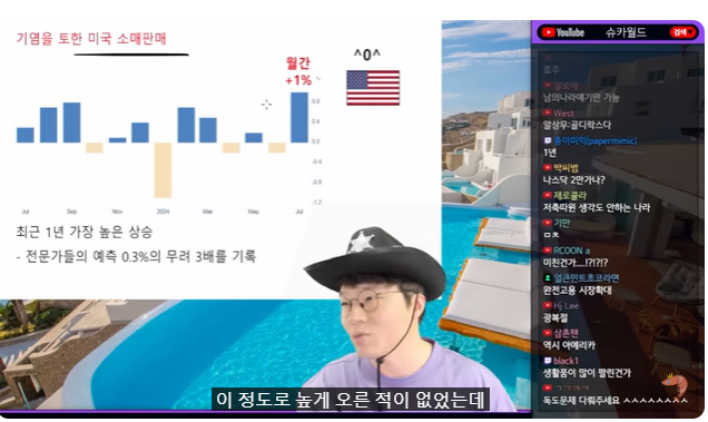 (01:00) 3% 였습니다 3배로 올랐어요 미국 지표 안 좋다 뭐 침체가 오네 마네 얘기했던 게 이거거든요 ㅎㅎㅎㅎ 이거 조금 안 좋다고 뭐 미국이 드디어 침체가 오고 어쩌고 하다가 우리 형님들은 역시 그딴 거 가볍게 무시해주고 월간 1%로 치솟아 올라왔습니다 정말 말도 안 되는 숫자라고 할 수 있는데 미국의 소매 판매가 사실은 제 생각에는 좀 안 좋을 수가 없었던 게 왜냐하면 주가를 보면 알 수 있어요 무슨 주가를 보면 알 수 있냐 이게 미국 월마트 주가입니다 예전에 슈카월드 몇 번 나왔죠 최근 주가가 업데이트가 안 됐는데 여러분들이 모르실까 봐 제가 갖고 왔어요 최근 값까지 다 업데이트한 주가입니다 최근 1년에 38%라고 적었는데 연초 이후도 비슷해요 그냥 올해 연초 이후로 해도 30% 이상이 올랐어요 최근 5년 코로나 이후로 따지면 2배 올랐어요 2배가 올랐어 ㅎㅎ 이게 뭐야 아니 이게 무슨 IT 기업도 아니고 내 IT 기업이면 이해를 합니다 멀티플이 가능하잖아요 AI 되고 반도체 되고 플랫폼 기업이면 올해 1억 구독자가 있다 그래도 내년이면 3, 4억도 될 수 있는 거니까