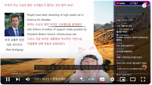 (21:35) 10억 명이 봤다 이렇게 했지만 한 2,700만 명 정도 봤다고 얘기하는 대담 시간 있었어요 이때 트럼프는 뭐라고 얘기했냐? 이거 갖고 온 이유는 좀 황당해서 나는 전 세계 수많은 고속철도를 봤는데 너무 멋있었고 너무 잘 되고 편리하고 안정성이 최고였다 그런데 이 바이든 이거 봐라 봐라 봐라 정작 세계 최강 미국에는 지금 고속철도가 없다 대통령이 이거 이거 문제 아니냐? 미국에는 이거 다른 나라에 있는데 최고의 철도가 없는 게 말이 되냐? 라고 얘기하시더라고요 그래서 이걸 보면서... 뭐지? 트럼프가 대통령이 돼도 고속철도 깔릴 수도 있겠다 앞으로 2025년에는 그런 생각을 잠깐 했습니다 잠깐 그런 생각을 했는데 뭐지? 정신과 생각이 분리가 되셨나? 이런 생각을 잠깐 했는데 그리고 트럼프가 2018년에 대통령이 돼서 철도망이 안 깔렸지만 그다음 바이든이잖아요 그래서 바이든 취임 이후에 미국의 고속철도 개발 사업이 지금 막 추진되고 있습니다 아까 제가 처음으로 미국의 고속철도망이 등장을 한다 왜? 지금 대통령이 바이든이기 때문에 그래요 2021년 대통령이 되자마자