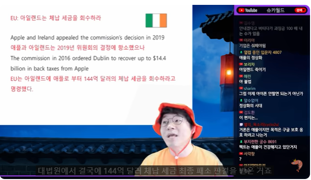 (02:59) 낼 게 뭐 하고 그냥 단신 처리처럼 넘어갔는데 물론 애플이 반발을 했죠 19조 원이 누구 애 이름도 아니고 이렇게 반발했습니다 이번 사건은 우리가 세금을 얼마 내냐 이게 문제가 아니라 누구한테 내고 있냐를 따져야 되는 문제다 우리는 아일랜드에서 내고는 있지만 본사가 있으니까 미국에서도 세금을 내고 있어 이중과세 아니냐 이중과세 미국에 내고 있는 것도 고려해줘야지 왜 아일랜드만 내라고 그러냐 라고 반발을 했고 애플의 입장은 그럴 수 있죠 세금 많이 내는 거 싫으니까 근데 여기서 놀라운 사실은 아일랜드의 입장은 어떨까요? 하늘에서 19조 원이 떨어졌습니다 나 가만히 있었는데 EU 최고 법원이 나보고 19조 받으래 어? 저요? 네 맞아요 나 아무 한 게 없는데 19조 원? 하늘에서 떨어졌어 하늘에서 19조 원 뚝 떨어지니까 감사합니다 라고 하실 줄 알았으면 아직은 조금 생각을 더 해보셔야 되고요 하늘에서 19조 원이 떨어졌지만 어떻게든 안 받으려고 몸을 베베 꼬고 있습니다 아까 잠깐 지나갔는데 애플과 아일랜드는 손을 잡고 EU 최고 법원에 항소를 했어요