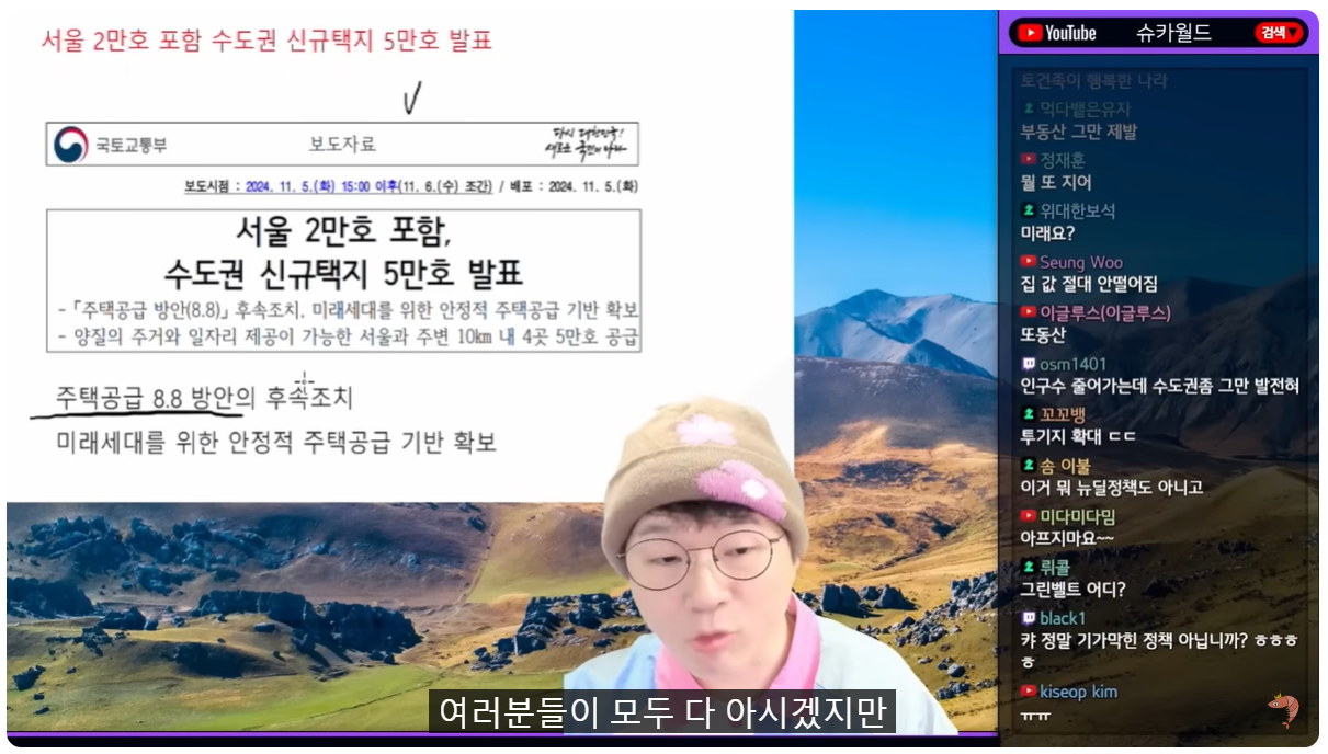 (00:07) 자, 네 번째 주제 수도권 신규 택지 5만 호 발표 우리들의 얘기입니다 수도권의 신규 택지로 주택 5만 호를 추가 공급하겠다 서울의 2만 호를 포함해서 수도권, 서울에서 10KM 이내 지역에 5만 호 주택을 짓겠다라는 거죠 주택공급 88대책의 후속조치고요 미래 세대를 위한 안정적 주택공급 기반을 확보하겠다 이렇게 발표를 했습니다 자 그럼 이 내용을 보기 전에 예전에 88 대책이 나왔을 때 제가 슈카월드에서는 다루지는 않았었는데 여러분들이 모두 다 아시겠지만 주택공급 88 방안 다시 한번 살펴보도록 하겠습니다 어떤 내용이 있었는지 그래야 이번 신규택지 공급이 이해가 돼요 주택공급 88 조치라는 게 있었죠 2024년 8월 8일 날 서울과 수도권에 무려 42.