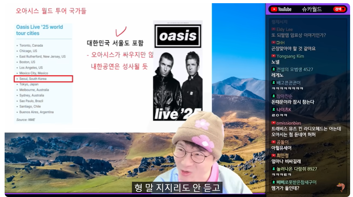(00:07) 첫 번째 내용은 이거 아시는 분도 있고 모르시는 분도 있을 텐데 오아시스라는 그룹이 내한 공연을 한다고 발표를 했습니다 지난 여름에 발표를 했죠? 8월? 8월에 발표를 했는데 영국에서 공연도 실제로 했죠 표 가격에 대한 얘기가 나오고 있습니다 비싸냐 싸냐의 문제가 아니죠 어떤 내용이 이슈가 되고 있는지 한번 알아보는 시간을 갖도록 하겠습니다 자 일단 오아시스가 월드투어에 나섭니다 2025년 오아시스가 재결합해서 월드투어를 하겠다 그리고 다른 나라에서는 그렇게 큰 관심이 없었는데 놀랍게도 오아시스 월드투어 국가에 대한민국 서울이 포함됐습니다 이제 곧 설명드리겠지만 저 오아시스는 그룹의 가장 큰 문제가 둘이 싸우는 거거든요 놀랍게도 그래 이 그룹의 가장 큰 문제는 둘이 싸우는 거야 싸우면 안 올 수도 있습니다 실제로 이슈가 되고 있어요 왜 싸우냐? 형제야 다 아시죠? 형, 동생 근데, 동생이나 형이나 말을 치지리도 안 듣는 거는 동서고금이 똑같아 형 말 지지리도 안 듣고 동생 지지리도 구박하는 건 똑같기 때문에 저 형제가 싸우면 일단 못 올 수도 있는