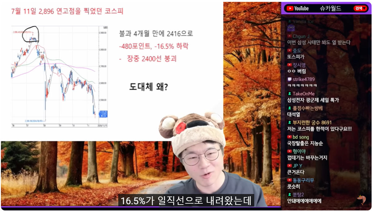 (05:17) 향후 1년간 총 10조 원 규모의 자사주를 분할 매입하겠다 3조 원의 자사주는 3개월 내에 사들여서 전량 소각을 하고 내년 2월 17일까지는 장내 매수 방식으로 10조 원을 사들이겠다라고 부양책을 내면서 급한 불을 끄려는 그런 모습을 보였습니다 자 그런데 삼성전자는 급한 불을 끄려는 모습을 보였는데 대한민국 코스피는 어떠냐? 제 생각인데요 거의 이 정도면 동방의 명경지수다 명경지수가 뭐냐면, 한자입니다 명경, 맑은 거울 지수, 맑은 거울과 같은 고요한 물 사념 없이 어허허 어허허허 천천히 명경지수와 같이 천천히 노 젓는 야야야 이게 뭐야 이게 이게 호수지 호수 맑은 거울과 같은 앞으로 주가지수라고 부르지 말고 명경지수라고 불러야 되지 않을까 이 정도면은 가끔 사념이 와 가끔 인간이다 보니까 가끔 악귀들이 머릿속에 들어와서 이런 잡념 사념이 자꾸 오긴 하는데 금방 안정되죠 우리한테 마음을 편안하게 하면은 후