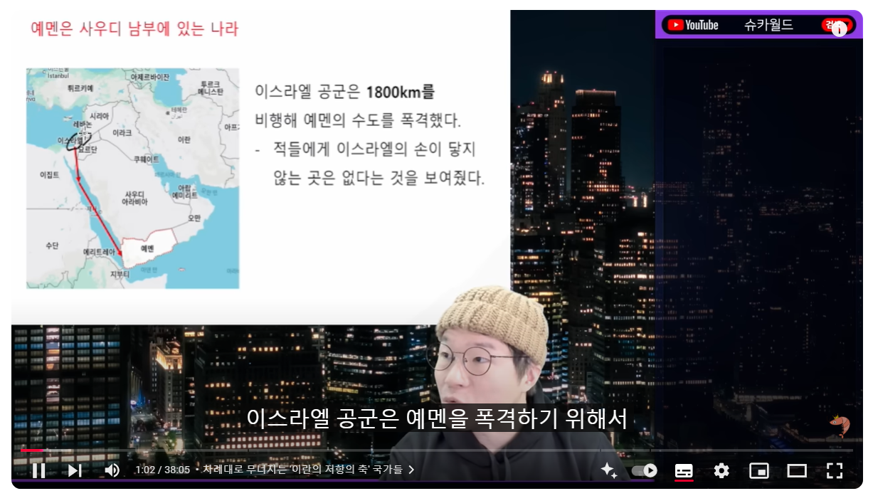 (00:08) 자, 오늘의 마지막 주제는 바로 이스라엘이 되겠습니다 왜 이스라엘이냐? 이스라엘은 지금 전쟁을 하고 있어요 전쟁이 사실상 일상인 나라가 됐어요 그러면 이스라엘의 경제는 망했을까? 이스라엘 경제는 얼마나 개판이 됐을까? 이게 오늘의 주제입니다 이스라엘의 오늘을 보면 이스라엘은 바로 엊그제 예멘의 수도를 폭격했습니다 예멘이면 후티 반군이 있는 곳이에요 후티 반군이 있는 예멘의 수도와 여러 항구를 목표로 삼아서 폭격을 날렸어요 조금 날린 게 아니라 최소 6명이 이상이 사망한 대규모 공습을 날렸습니다 저 멀리 있는 이스라엘이 비행기를 보내서 예멘에 폭격한 거예요 이게 예멘의 항구예요 예멘의 수도 이런 데를 폭격을 해서 불바다로 만들었습니다 참고로 예멘은, 지금 잘 안 나실까 봐 제가 보여드리면 사우디 남부에 있는 나라예요 이스라엘 입장에서 굉장히 멀어요 사우디를 어떻게 보면 횡으로 가로질러야 돼 이스라엘은 북쪽에 있잖아요 예멘은 저 남쪽에 있어요 이스라엘 공군은 예멘을 폭격하기 위해서 1800KM를 비행해서 예멘 수도를 폭격한 겁니다 그리고 돌아간 거예요
