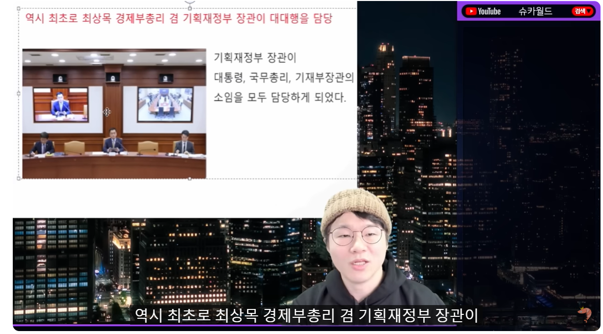 (00:08) 자 이번 주제는 정말 가슴이 아픈 주제입니다 위기의 석유화학 산업 요즘 우리나라에 가장 큰 걱정 중의 하나가 바로 석유화학 석화 산업입니다 지금이 어떤 상황이냐 이 녹화를 하는 이 쯤은 헌정사상 최초로 한덕수 권한 대행의 탄핵안이 가결된 때입니다 이렇기 때문에 한덕수 권한 대행의 직무와 권한이 정지가 됐고 역시 최초로 최상목 경제부총리 겸 기획재정부 장관이 현재 대대행을 담당하고 있습니다 대행의 대행을 본 것도 아마 최초가 아닐까 생각이 되는데 현재 기획재정부 장관이 대통령, 국무총리, 기재부 장관 세 가지의 소임을 모두 담당하고 있는 한마디로 임시체제죠 임시체제가 흘러가고 있는 게 요즘의 우리나라 정치입니다 자, 이런 혼란 앞에서 12월 24일 어지러운 정국 속에서 경제관계장관회의가 개최됐습니다 장관들이 다 모여서 내년 아니면 지금 시급한 경제의 문제가 어떤 거냐 논의하는 자리인데 이 회의에서 석유화학산업 경쟁력 재고 방안이 논의가 됐습니다 물론 건설도 나왔고 녹색 투자 이런 것도 나왔는데 제일 앞에 있는 건 역시 석화산업의 경쟁력 재고 방안이었어요