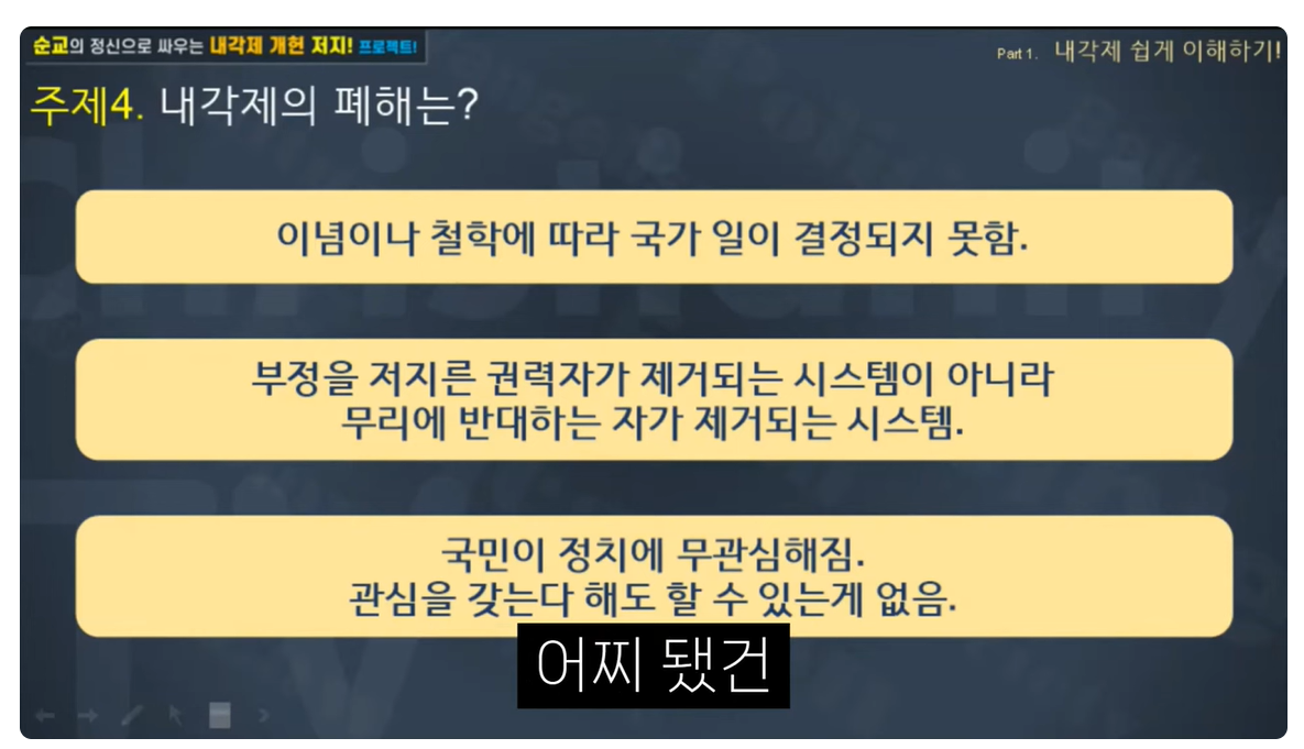 (01:59) 불리와 부정 을 보게 됐을 때 이거에 대해서 문제를 쉽게 제기할 수 있는 사회 분위기가 있어야 내각제가 의미가 생깁니다 그니까 개인의 위대한 개인의 힘이 있어야지 내각제는 가능해집니다 근데 우리나라는 지금 집단주의적인 성향이 많잖아요 그러니까 이거는 내각제가 되면은 이거는 밥이 없는 상황이고요 마지막으로 이게 좀 협의가 가능한 사회 구조가 돼야 되는데 그게 무슨 말이냐면 우리나라처럼 공산주의와 자유주의가 이렇게 사상적으로 부딪히는 사회에서는 서로 협의가 안 되잖아요 만약에 우리나라의 한 20% 이슬람이 한 30% 기독교다 이러면 내각제 하면 난리납니다 그러니까이 협의가 가능한 뭐 예를 들어서 일본처럼 신토 아는 자기네 어떤 종교 안에서 국가가 어느 정도 갖춰져 있고 이렇게 좀 사회가 갇힌 사회여서 여기에 빠져나가면 죽는다라는 어떤 두려움이 있어서 마음에 안 들어도 협조해야 된다라는 그런 어떤 사회 구조가 되어 있으면 내각제가 가능하지만 우리나라처럼 나랑 반대하는 사람을 죽이고 싶어 하는 성향이 있는 어떤 한국 사람들의 성향상 내각제를 하면