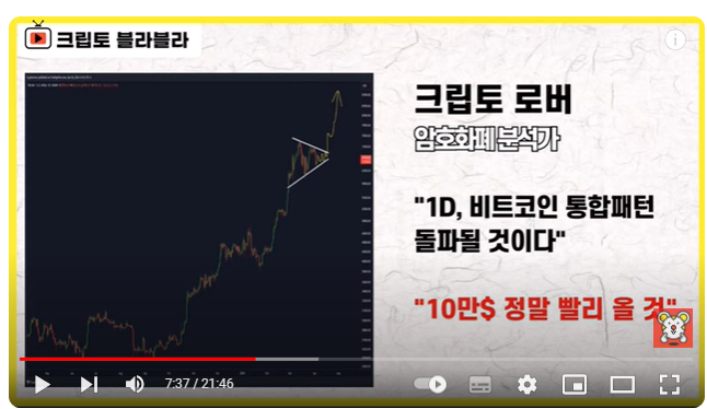 (06:33) 느낌이잖아요 그래서 과연 이게 어떤 흐름을 보여주고 또 시장 정서가 어떻게 움직이게 될 것이고 또 비트코인 반감기에 이른바 패턴이라는게 있는데 그 패턴이 어떤 방식으로 이전 패턴과 비슷함을 보여 주면서도 차이점을 또 내보이게 될지 이런 부분들을 우리가 앞으로 몇 달에 걸쳐서 지켜봐야 하고 이걸 통해서 우리의 투자 전략을 액션으로 옮겨야 되는 그런 상황이 이제 거의 다 왔다 예 그렇게도 바라볼 수 있을 것 같습니다 그거 지금 똑같은 차트요소 통화 패턴이 곧 돌파될 것으로 보인다 10만 달러 정말 빨리 올 것이다라고 한때 맥도날드 보였던 크립토 로버가 이야기를 하고 있습니다 7만 달러도 생각했던 것보다 정말 빨리 왔잖아요 그래서 10만 달러도 그러니까 8만 달러에서 10만 달러 구간도 우리가 생각했던 것보다 꽤 빨리 올 수 있지 않을까 지금 비트코인이 꽤 조정을 한 달 가까이