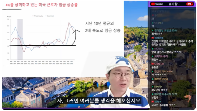 (00:07) 자, 이걸로 여러분들 문제 하나 낼 테니 한번 맞춰보십시오 미국의 구인난이 아직도 높은 것은 여러분도 알고 저도 아는 사실입니다 미국은 아직도 사람을 구하고 있어요 사람 구해요가 엄청 올랐다가 조금 떨어지긴 했는데 그래도 평상시 값에 비하면 말도 안 되죠 거의 두 배에 가까운 구인난을 호소하고 있습니다 미국에 이렇게 사람이 없어 게다가 미국 근로자 임금 상승률을 보면 인플레이션이 올라가는 게 다 이유가 있습니다 4%가 평균적으로 넘고 있어요 기존에 한 2%대였는데 거의 2배가 올라간 거지 이게 평균이니까 많이 올라간 데는 더 많이 올라갔다고 볼 수 있습니다 자, 그러면 여러분들 생각을 해보십시오 사람을 구해, 근데 임금도 많이 올라 인건비 지수를 잠깐 보여드릴까요? 참고하시라고 요렇습니다 비농업 근로자 인건비 지수가 요러다가 요렇게 올라가고 있어요 역대 최고치를 연일 올라가고 있습니다 그러면 무슨 힘이 강해지겠습니까? 사측의 힘이 강해지겠습니까? 노측의 힘이 강해지겠습니까? 우리나라로 치면 노사관계라고 그랬을 때 근로자의 힘이 강해지겠습니까?