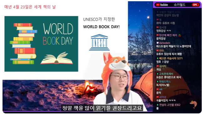 (19:30) 독서가 정말 우리의 어떻게 보면 글을 읽는 훈련이기도 하고 정말 좋은 내용들이 많이 있죠 독서를 많이 하는 책의 날을 맞이해서 재미있는 책이 많기 때문에 독서의 날을 맞이해서 책 한 권 읽으시는 여러분 되시길 바랍니다